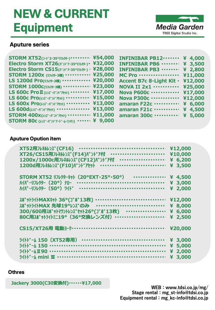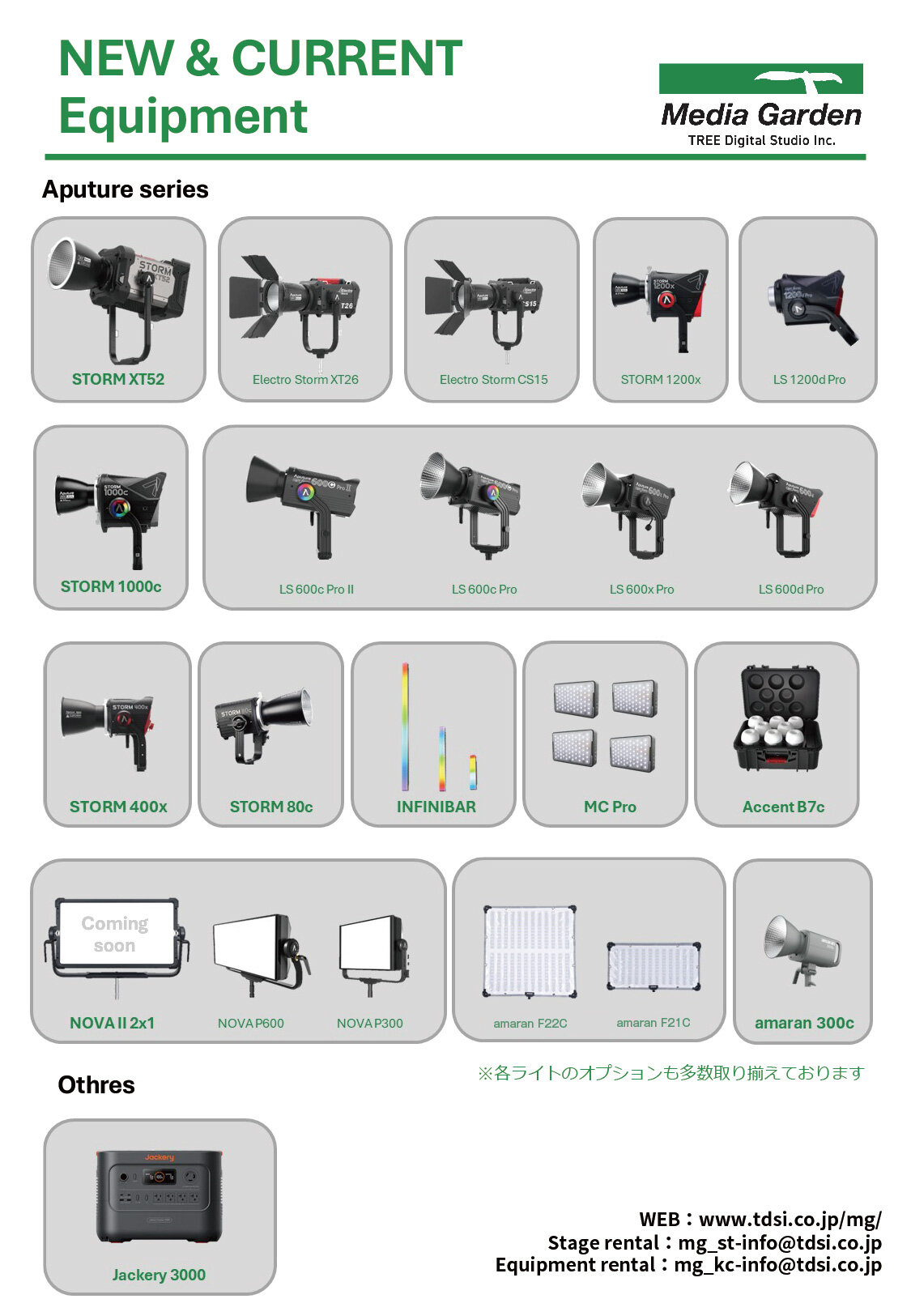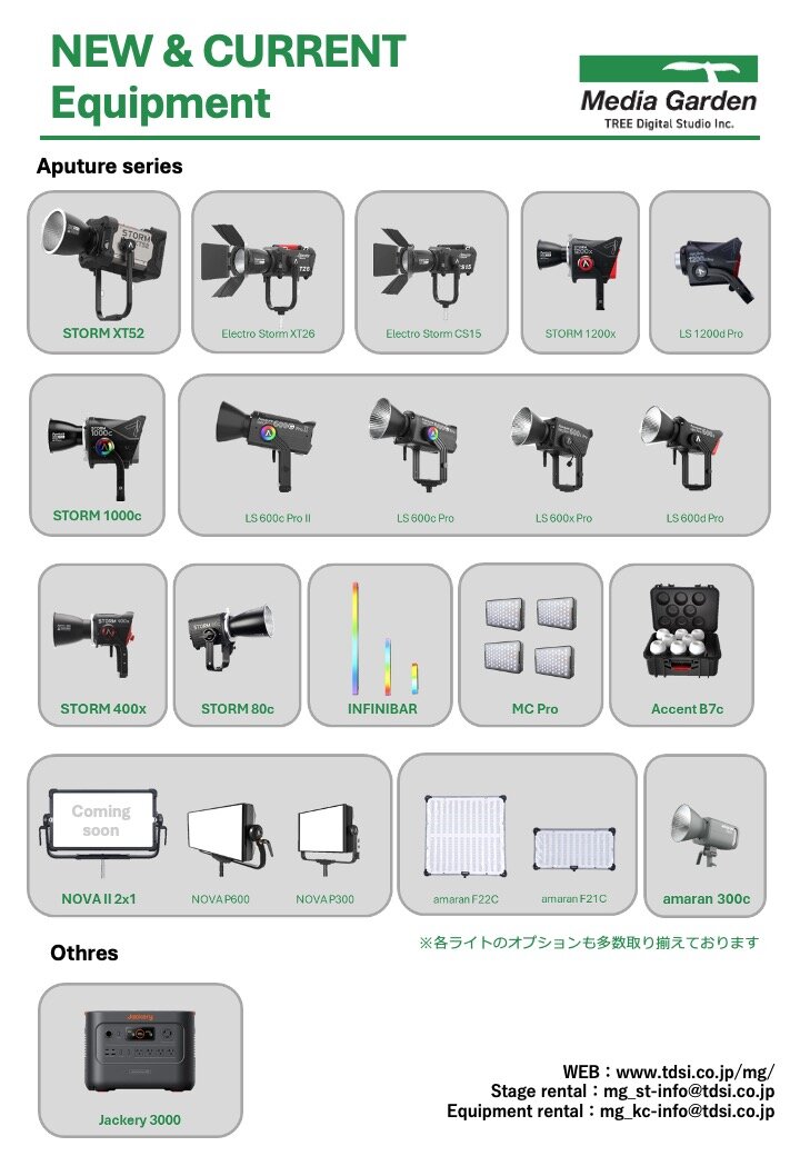 この度、Media Garden事業部のレンタル機材に、LEDライトやパネルライト、チューブライト、バルブライトなどのAputure製照明機材を多数導入しました。